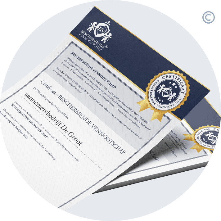 Nadat VRB uw BV als echte BESCHERMENDE VENNOOTSCHAP® / KONINGSSTRUCTUUR heeft opgericht én nadat jaarlijks de jaarrekening is besproken ontvangt u van VRB een ‘CERTIFICAAT VAN BESCHERMING’.
