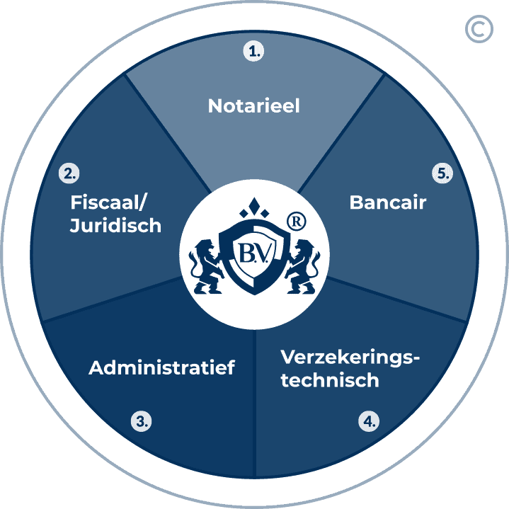 Het model van de ‘Schijf van Vijf’ bevat vijf schijven die van belang zijn om er uiteindelijk voor te zorgen dat uw BV fungeert als een echte ‘BESCHERMENDE VENNOOTSCHAP ®’. Deze vijf schijven zijn:
