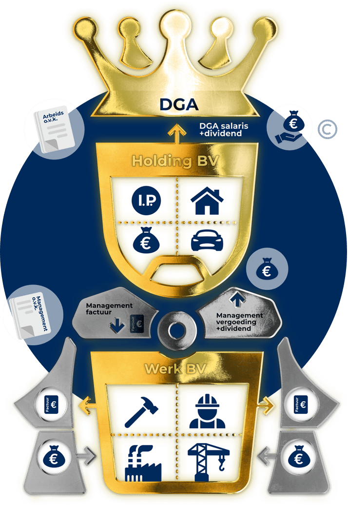 Een goed opgerichte en goed aangeklede holdingstructuur biedt zoveel voordelen en mogelijkheden voor ondernemers, dat wij deze structuur bij VRB ook wel een ‘KONINGSSTRUCTUUR’ noemen.